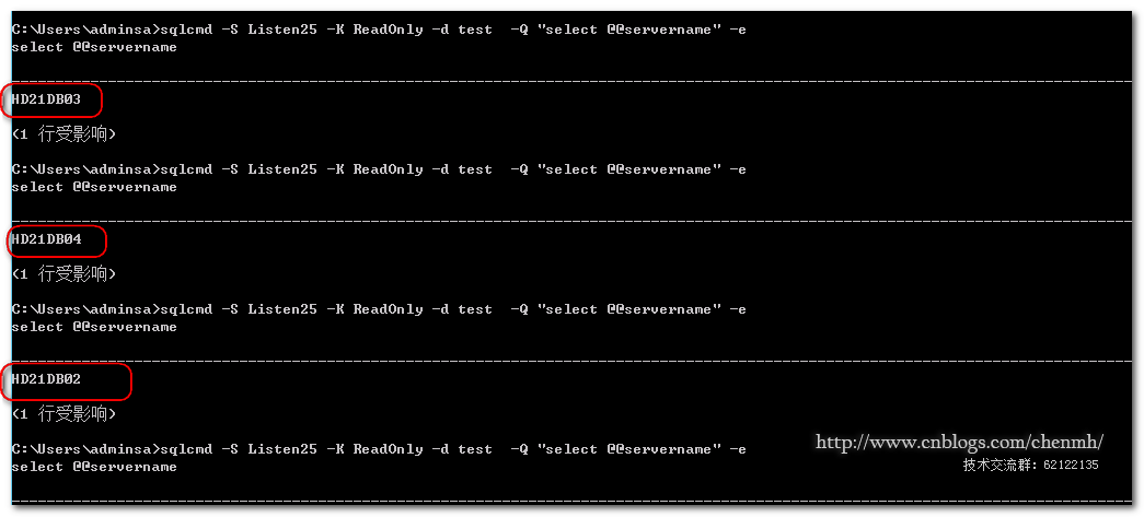 当HD21DB01作为主节点时,HD21DB02,HD21DB03,HD21DB04平均分摊读的压力,当HD21DB02,HD21DB03,HD21DB04都无法访问时读连接访问HD21DB01;演示如下:
