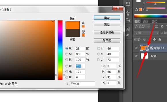 双击圆角矩形图层缩略图的右下角,弹出拾色器,选择想要的颜色,这里是#ff7906