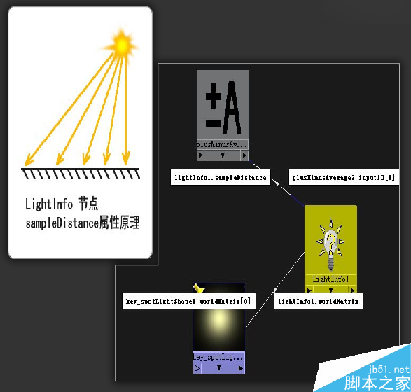 下面我们创建一个LightInfo节点,链接方式如图所示,通过这个节点的SampleDistance属性我们可以得到主灯到被作用物体的采样距离,这个值是一个随着物体位置上采样点不同而变化的值,同时再链接一个PlusMinusAverage节点,为后面的计算做准备。(图05)