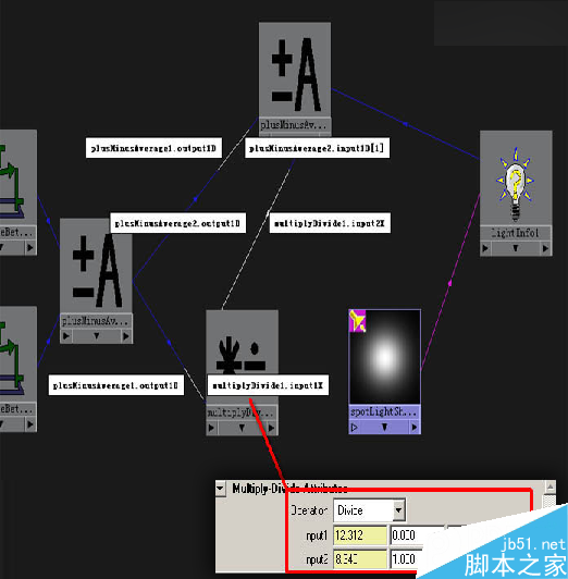 继续创建PlusMinusAverage和MultiplyDivide两个节点,利用PlusMinusAverage求上图中1和2的差值。而MultiplyDivide节点则输出数值提供给下一步的计算,连接方法如下图所示,PlusMinusAverage的计算方式选择为Subtract减法计算。 这样我们可以计算出两个距离差值。MultiplyDivide节点是为后面的计算作准备。(图04)