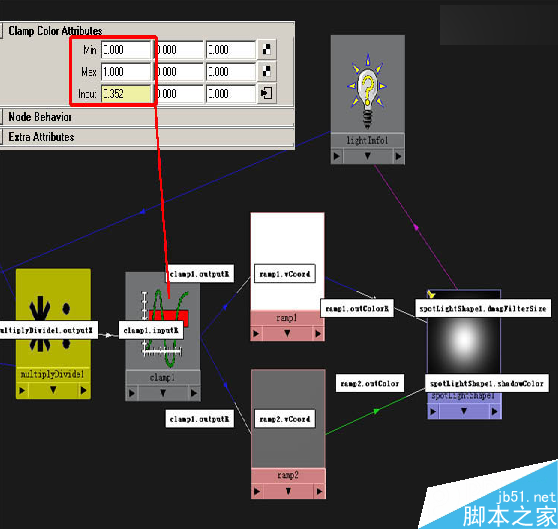 创建两个Remp节点,通过上面得到的数值来控制灯光投影的属性,链接方法如下,我们创建的Clamp节点的作用是截取了一段数据,这段数据的范围被设置成0到1,以此来控制Ramp节点的vCoord属性。(图07)