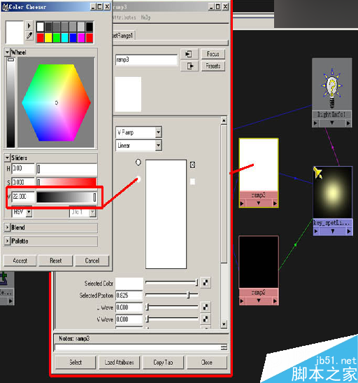 如图调整Ramp的颜色分布来控制灯光的阴影深度分布和阴影的。(图08)