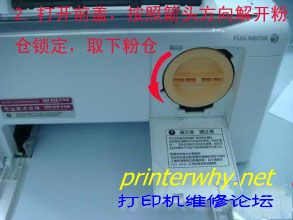 2、打开前盖,按照箭头方向解开粉仓锁定,取下粉仓