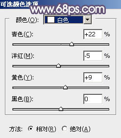 6、创建可选颜色调整图层,对红、黄、白,中性色进行调整,参数设置如图17 - 20,效果如图21。这一步给图片增加淡黄色。