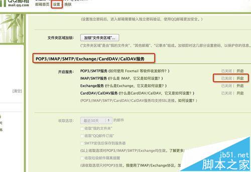 5、要解决“无法验证帐户名或密码”的问题,你需要进入你的qq邮箱里面,点击“设置”->“帐号”->向下滑动找到“POP3/IMAP/SMTP/Exchange/CardDAV/CalDAV服务”->找到“IMAP/SMTP服务”并点击后面“开启”按钮,如下图所示: