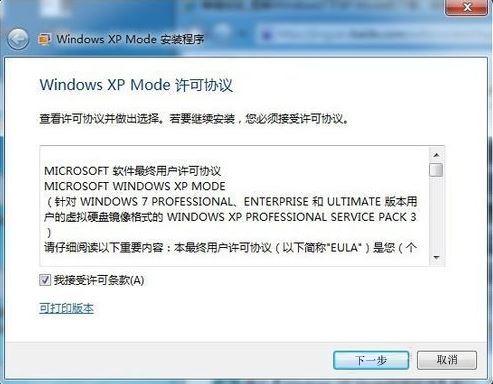 8、弹出【Windows XP Mode安装程序】窗口,勾选【我接受许可条款】,单击【下一步】继续;