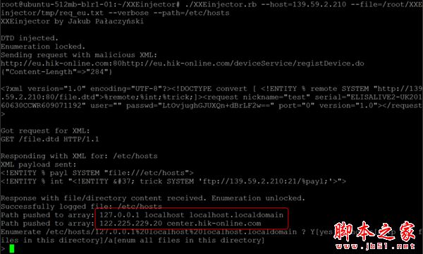 !这就有意思了,既然我们可以使用SYSTEM entity方式加载引用外部实体,就可以通过恶意dtd文件调用回传其它网站文件,如/etc/hosts文件等。所有这些过程都可以通过一个好用的自动化工具XXEinjector来完成: