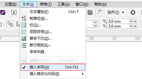 1. 单击菜单栏中“文本>插入字符”命令。