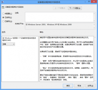 1、组策略 中用户配置-管理模板-系统-驱动程序安装-“设备驱动程序的代码签名”,双击,设置选“已启用”,“当windows检测到一个没有数字签名的驱动程序文件时”,选“忽略”,确定。
