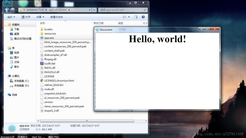 里面有我已将内容为 hello,world 的 index.html 网页通过 Electron 框架打包为 windows 环境下的桌面应用。
