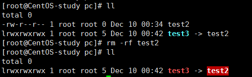[root@CentOS-study pc]# ll total 0 -rw-r--r-- 1 root root 0 Dec 10 00:34 test2 [root@CentOS-study pc]# ln -s test2 test3 [root@CentOS-study pc]# ll total 0 -rw-r--r-- 1 root root 0 Dec 10 00:34 test2 lrwxrwxrwx 1 root root 5 Dec 10 00:42 test3 -> test2 [root@CentOS-study pc]#