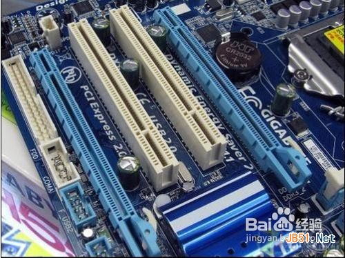 2、蓝色的两根长的,都是PCIE插槽,插显卡的,中间的白色的2个,是PCI插槽,插声卡等东西的,PCIE插槽是最近几年主板普及的,金手指栏在左边。