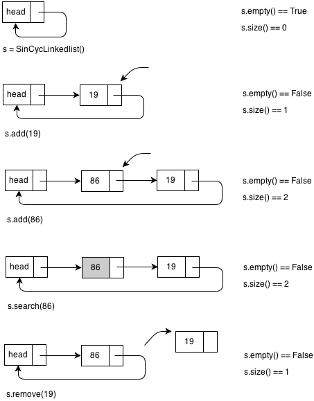 $ python sincyclinkedlist.py s.empty() == True, s.size() == 0 s.empty() == False, s.size() == 2 86 is in s 4 is not in s s.empty() == False, s.size() == 2 s.empty() == False, s.size() == 1
