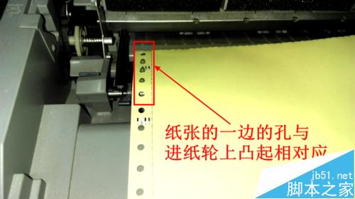 4、将多联打印纸背面朝上,一边小孔与放入左侧进纸轮的圆形凸起上。
