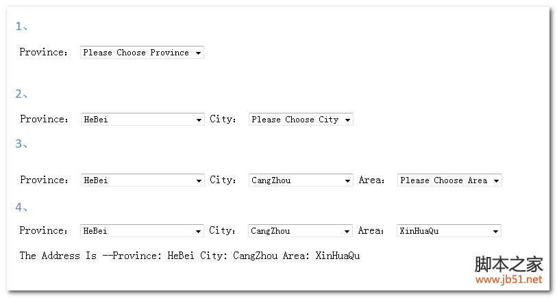 $("<span>The Address Is --Province: "+ProvinceSelect.val()+" City: "+CitySelect.val()+" Area: "+AreaSelect.val()+"</span>").appendTo(AddressSelect);