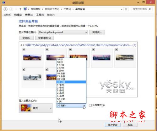 大家可以点“桌面背景”,进一步挑选自己喜欢的部分壁纸,设置图片位置、幻灯切换时间间隔以及是否无序播放等。 我们刚刚安装的这个Win8官方主题中包含有多张专为双屏幕用户提供的3840×1200像素超宽壁纸。如果我们使用的是单屏显示器,Win8系统会自动显示超宽屏壁纸的中间部分。