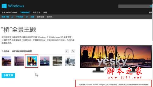 我们选择一个适合Windows 8和Windows RT系统的“‘桥’全景主题”【点击下载】,一般含有“全景”字样的大多都是双屏壁纸。微软官方Windows主题的详细介绍页面中会列出该主题中包含的壁纸,文字介绍、适合的Windows版本等信息,甚至可以在我们点击不同壁纸略缩图的时候在右边模拟显示出该图片在显示器中的效果。如下图所示,Win8全景主题可以在两个显示器中展示不同的拼接部分。