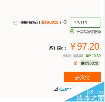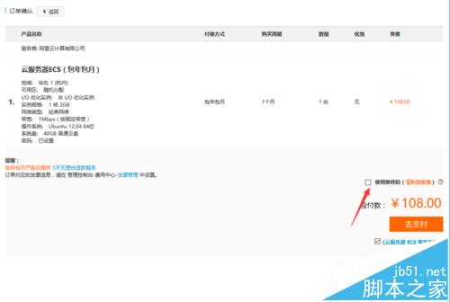 6、输入推荐码,支付之后就可以使用新购的ECS服务器。