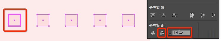将这个窗口,复制四个[选中它然后按住Alt同时向左拖动四次],复制好后,选中这5个正方形,按住alt键点选最左边的正方形(意思就是以最左边的正方形为操作对象),再将分布间距栏写14px,再点击水平分布间距(如图)