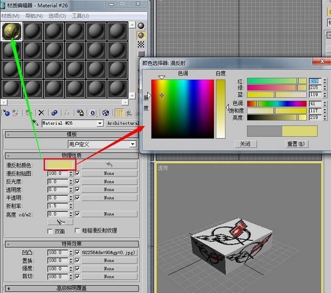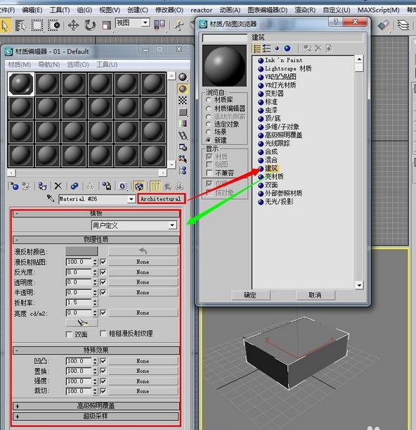 1、首先打开软件,建立一个长方体和打开材料编辑器(M快捷键),并且点击成建筑材料,得到如图界面: