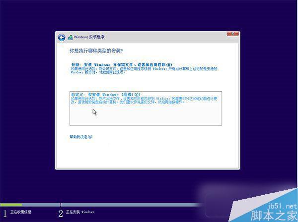 ▲由于我们目前执行纯净安装,因此要选择第二项“自定义”安装方式