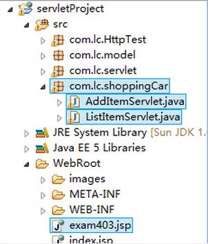 (1)用servlet实现简单的购物车系统,项目结构例如以下:(新建web Project项目 仅仅须要AddItemServlet , ListItemServlet。exam403.jsp三个文件就可以。其它的不用管)