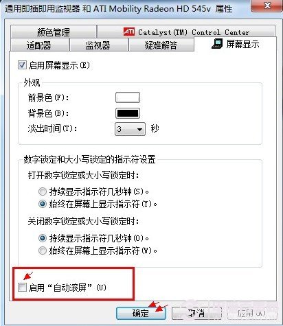 ⒊然后在弹出的监视器属性对话框中的“屏幕显示”菜单下找到“启用自动滚屏”选项,我们将其前面的勾去掉,之后点击下面的确定即可,如下图: