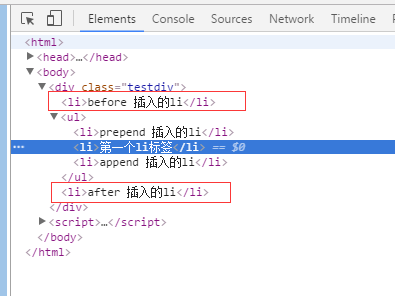 $('.testdiv ul').before('<li>before 插入的li</li>');