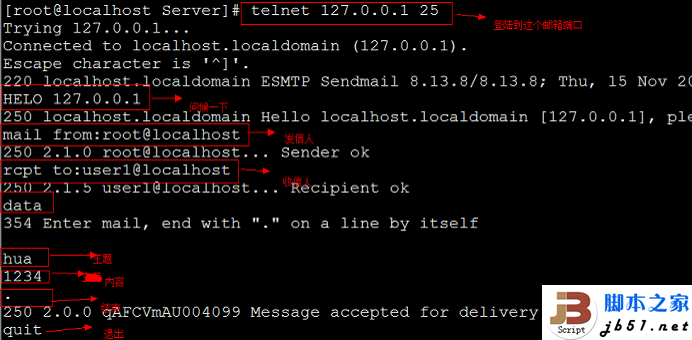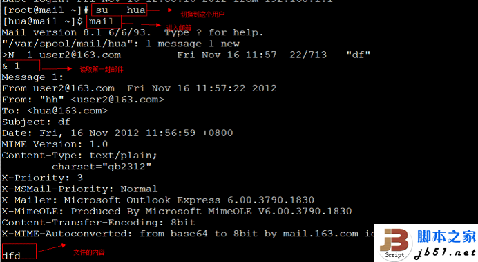 7. Server]# su - user1切换到user1用户,mail查看邮件即可root@localhost
