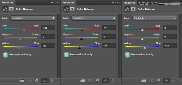 之后,在这两个图层之上,应用一个色彩平衡调整图层。取消勾选保留明度,然后将此图层的混合模式设置为明度。