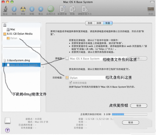 切记,就双击我提供bt下载的原版打dmg,什么都不用修改,什么都不用添加,直接按照上图恢复到优盘就可以了!就是这么简单!