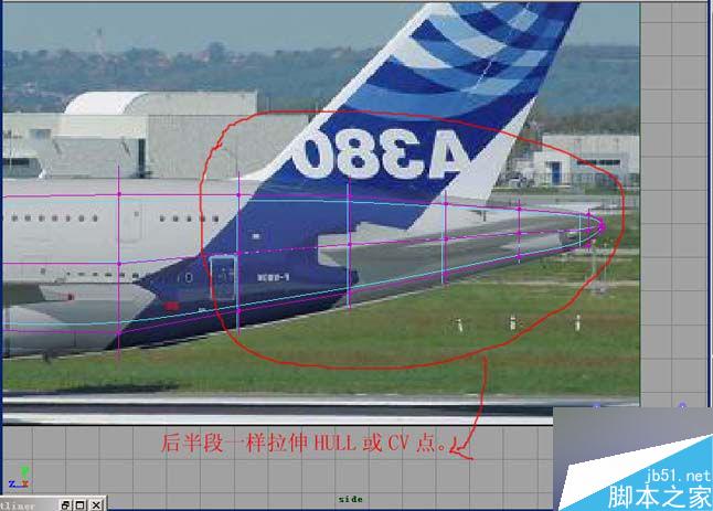 切换到HULL及CV点控制方式,拉升HULL和CV点,使其前面的形状和机身相符。