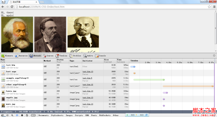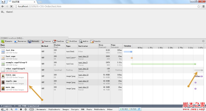 通过网络请求可以看出,example.css已经加载完成,other.js处于pending状态,但此时script标签底下的三张图片已经下载下来了,这是由浏览器的预先加载的功能所致。但是由于浏览器的渲染被other.js脚本阻塞住,所以,这三张图片连同它上面的“Hi again”都不会显示出来。另外,此时last.js中的代码还没有执行。