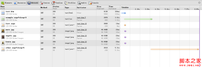 样式文件在head里,其他的连个脚本文件一个在body的开始部分,一个在body的底部。样式文件在body的开始部分,脚本文件的位置和上面的一样。测试的结果是这样的,在chrome中,样式文件的位置会影响到图片的下载时间,而在另外两个浏览器中这两种情况没有区别。下面是详细的测试过程。