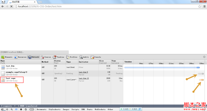 从上图中可以看出,test.htm 文档已经加载完成,页面上还没有显示任何东西,example.css处于pending状态,但是,位于最底部的last.js却加载完成了。这说明chrome进行了预加载,提前下载,放在了浏览器的缓存里了。虽然last.js已经加载完成,但是还没有被执行,因为他前面的样式文件会阻塞脚本的执行。