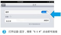 3、打开你的iPad平板电脑的蓝牙并搜索,平板电脑自行或手动搜索找到键盘名称(蓝牙名称:B.O.W),点击连接。