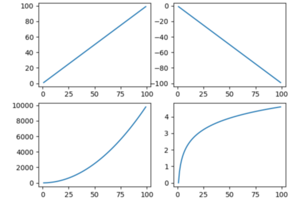 importmatplotlib.pyplotasplt importnumpyasnp x=np.arange(1,100) plt.subplot(221)#2行2列第1个图 plt.plot(x,x) plt.subplot(222) plt.plot(x,-x) plt.subplot(223) plt.plot(x,x*x) plt.subplot(224) plt.plot(x,np.log(x)) plt.show()