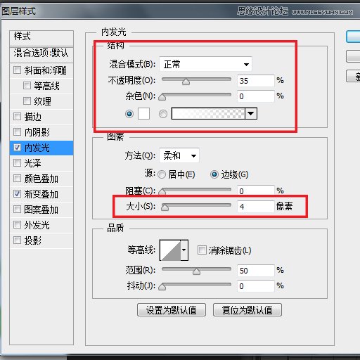 8.对设置图层添加图层样式,选择内发光和渐变叠加样式,参数如下