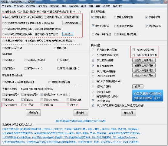 例如,可以部署一款“大势至USB端口管理软件”(下载地址:http://www.grabsun.com/monitorusb.html)来实现对电脑USB接口禁用、U盘使用控制。“大势至USB禁用软件”是一款专门禁用U盘、禁用移动硬盘和禁用手机等USB存储设备的软件,同时在禁用上述USB存储设备的同时还不影响USB鼠标键盘和加密狗的使用,实现了电脑USB接口的精确管理;同时,针对USB存储设备,大势至USB禁用软件还提供了更为精确的控制,例如可以实现“只允许特定U盘使用”、“只允许从U盘向电脑拷贝资料,禁止从电脑向U盘拷贝资料”、“允许从电脑向U盘拷贝资料但必须输入密码”等等,从而实现了对USB接口的精准控制,方便了企业在某些情况下使用USB的行为;此外,大势至禁用U盘软件还可以完全禁止电脑发邮件、禁止网盘上传、禁止QQ发文件、禁止FTP上传、禁止论坛留言发帖等,从而可以严防通过上述网络手段泄露企业商业机密的行为;如下图所示: