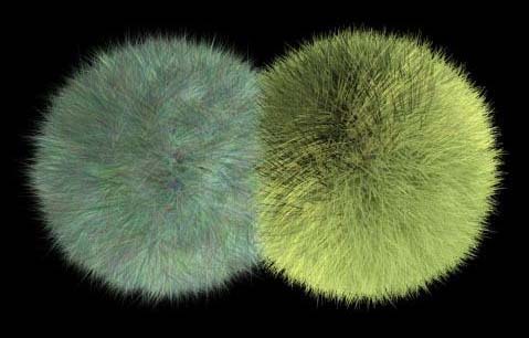4、用puppet shaders pack渲染。下载安装之后,我不会解释如何获得如愿的毛发外观,只是渲染,先创建两个球在场景中球A用的shave and haircut的grass预设,球B用的maya fur grass预设,我会解释如何工作的,选择你想要的: