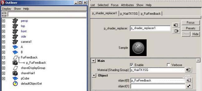 7、现在毛发的着色被shave定义。 用p_HairTK我们可以代替着色参数,将它和自带材质结合比起fur着色会更方便的控制而且效果也会更好,创建p_HairTK材质。对于maya fur:创建p_shader_replacer几何体材质中。打开P_HairTK的shading group,把fur feedback的transform节点改名为p开头的(p_FurFeedback,这一步看起来很奇怪,但非常重要)进入那个transform节点的Object栏下的Object[0]区域。