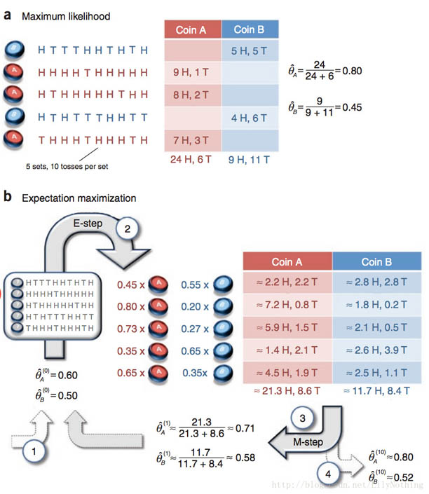 假设有两枚硬币A、B,以相同的概率随机选择一个硬币,进行如下的抛硬币实验:共做5次实验,每次实验独立的抛十次,结果如图中a所示,例如某次实验产生了H、T、T、T、H、H、T、H、T、H,H代表正面朝上。