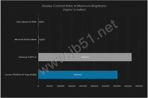 上图是两款配置OLED显示屏与最出色的两款LED显示屏笔记本对比度的比较,差别还是相当大的。当OLED显示屏显示纯黑色图像时,Digital Trends用来测试笔记本的传感器——Datacolor的Spyder5Elite,检测到的屏幕亮度为零。因此,对比度的值取决于显示屏的最高亮度。