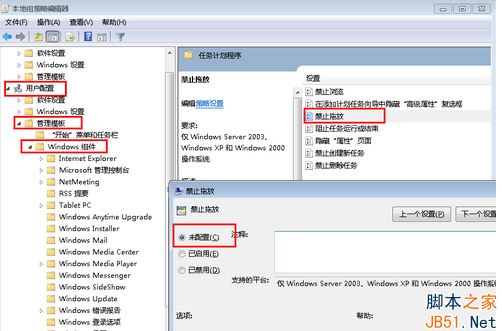 5、然后依次展开“用户配置-管理模板-windows组件”,然后单击“任务计划程序”;