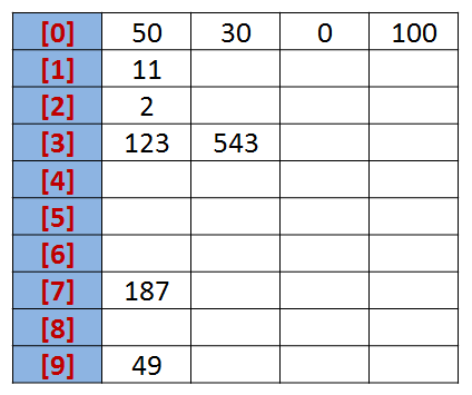 我们先根据序列的个位数的数字来进行分类,将其分到指定的桶中。例如:R[0] = 50,个位数上是0,将这个数存入编号为0的桶中。