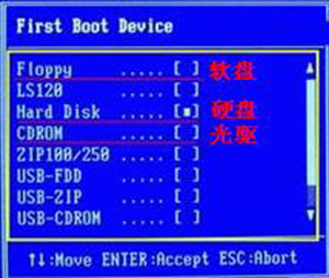 6、也有的情况,Boot菜单并没有Boot Device这样的关键字,而是把几个设备列举出来,前面的设备就是最先启动的,这时按+、-号按键把CDROM调整到硬盘(Hard disk)的上面(加号向上移动一行,减号向下移动一行)。