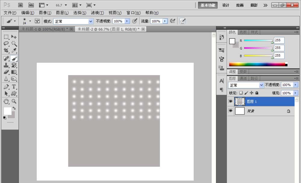 1、新建一个800*600像素的白色背景,新建一个图层,选择矩形选框工具,绘制矩形,填充淡灰色,然后新建图层,选择画笔工具,设置前景色为白色,画笔设置为柔软的画笔笔刷,然后按下shift键开始复制多个画笔,如图