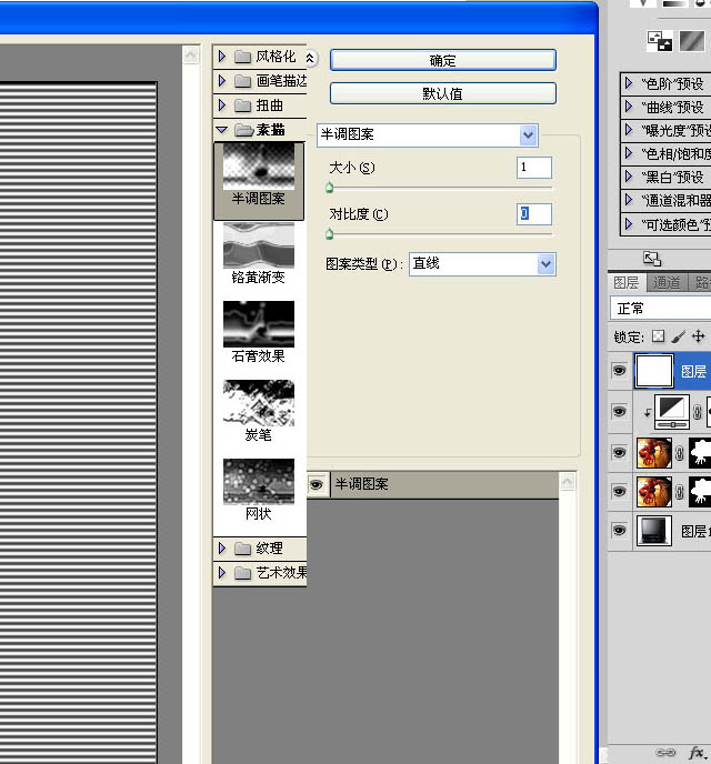 12、在上面新建一层,填充白色,执行滤镜-素描-半调图案。我想制作一个老式电视机的逐行闪动的效果。