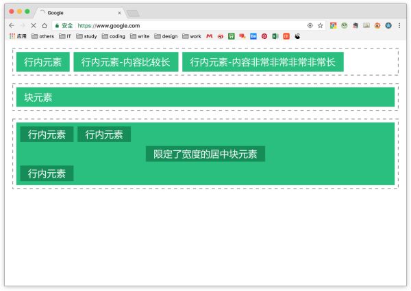 这两种元素的表现略有不同。图中虚线框代表一行,但实际上这是不可见的,只是我为了说明布局方式画出来的,其中的绿色矩形才是页面上真实可见的元素。
