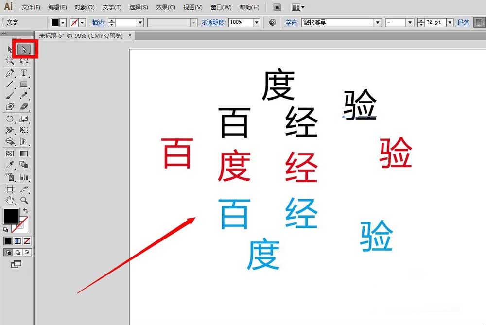 9、最后,我们使用白色箭头“直接选择工具”,选中每个字移动即可。画布上的文字都被打散成为单独的一个个文字了。